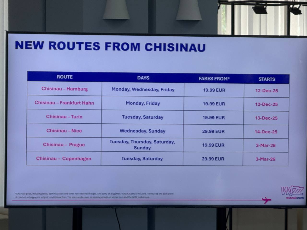 Veste bună pentru moldoveni. Compania Wizz Air va lansa, în curând, 6 curse aeriene noi de pe Aeroportul Chișinău spre orașe europene. E vorba de zboruri spre Hamburg, Torino, Frankfurt Hahn, Nisa, Praga și Copenhaga. Anunțul a fost făcut de directorul companiei Wizz Air, József Váradi, în cadrul unei conferințe de presă, alături de directorul AIC.